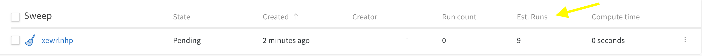 この例のデカルト積は 9 です。W&B は、この数値を W&B アプリの UI に推定実行数 (Est. Runs) として表示します: