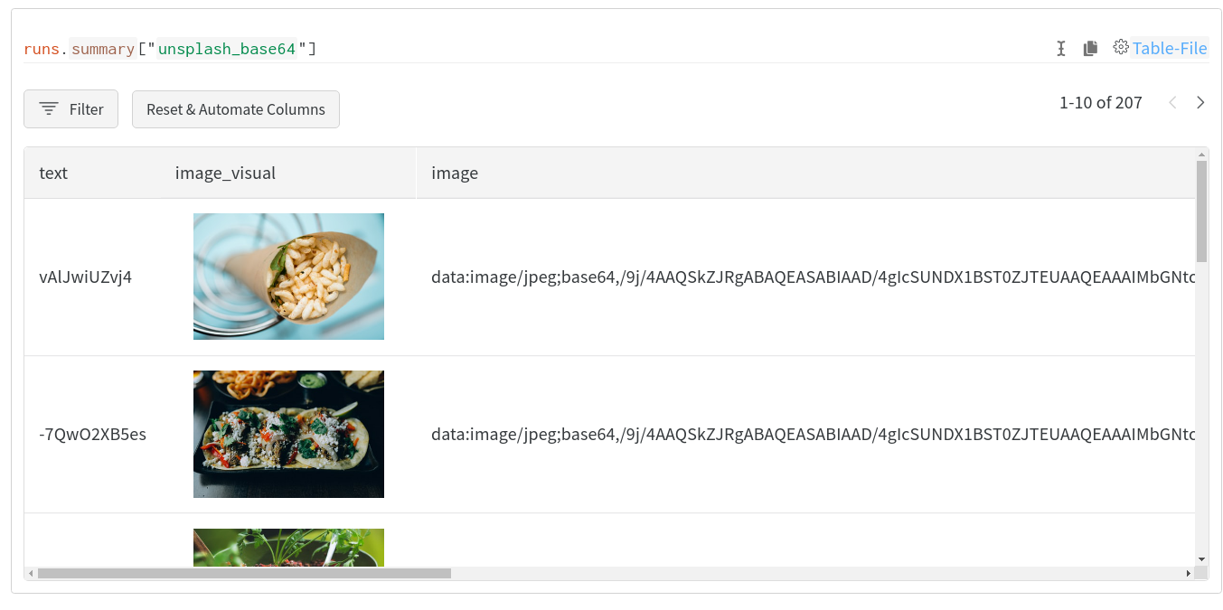 W&B는 자동으로 이미지와 명명된 엔티티 필드를 각각 wandb.Imagewandb.Html로 변환하려고 시도합니다. 이러한 시각화를 포함하기 위해 결과 테이블에 추가 열이 추가될 수 있습니다.