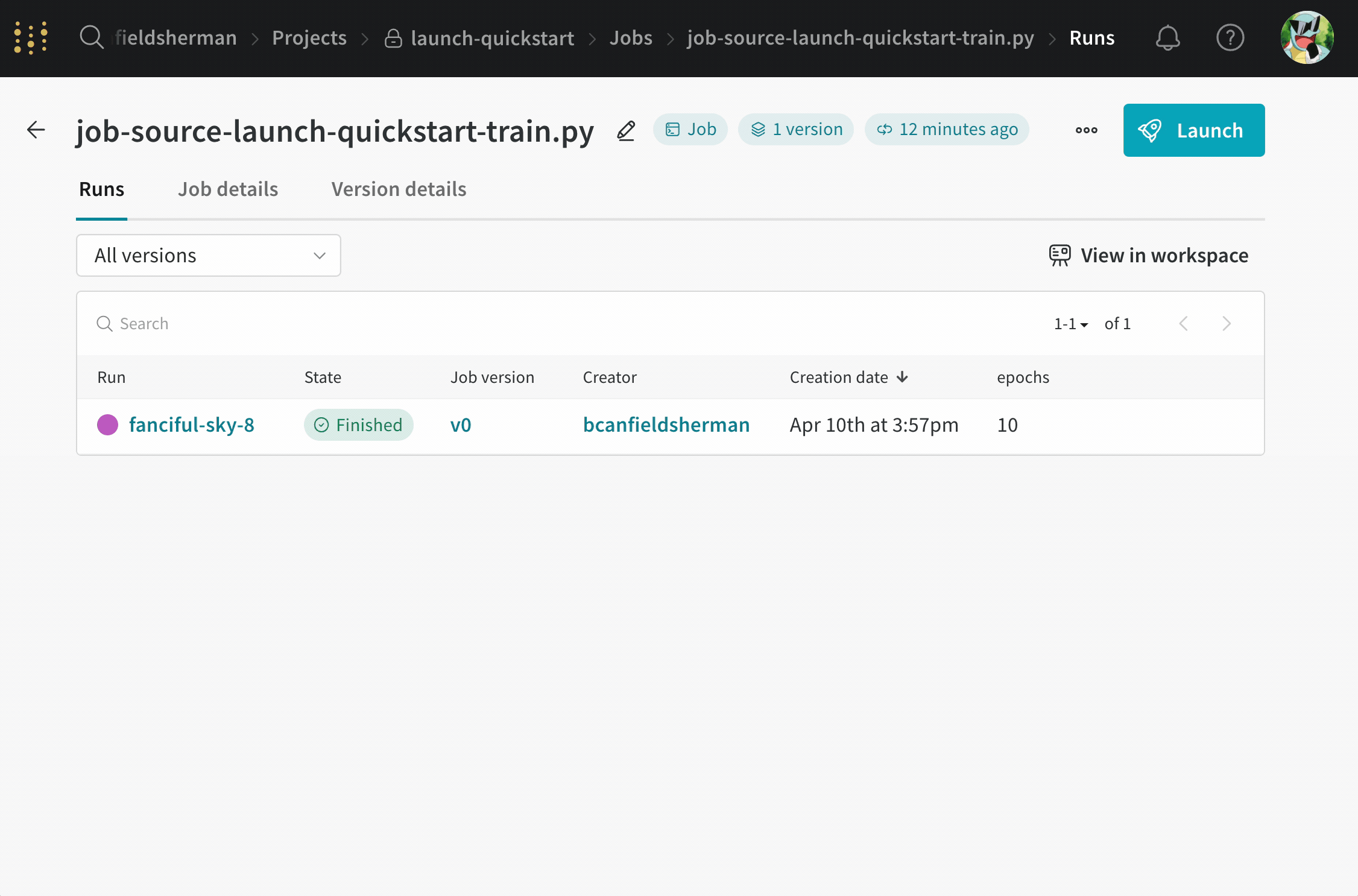 이렇게 하면 런치 작업이 생성됩니다. 위 예제에서 런치 작업은 launch-quickstart 프로젝트에 생성되었습니다.